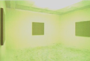 島 敦彦 麻布に絵具をつける行為の限りない持続のはてに、川井昭夫の絵画は生まれる。「色を支持体に近付けること、筆跡を全体性のなかへ消滅させること」がその最小限の要件である。 今回は、絵画十四点と植物によるインスタレーション一点を出品。まず注目されたのは、会場の一隅に仮説されたふたつの小部屋である。一方には七九年の「麻Typ-A」の連作が、もう一方には九四年の新作「意識の順列」がそれぞれ四点ずつ展示された。 双方の部屋の入口は向かい合う格好でしつらえられ、部屋の造りも、天井に張った紙を通して広がる柔らかい蛍光灯の光も、作品の寸法も材質も手法も、その配置もほとんど同じ、ふたつの部屋を何度か往き来していると、両者はまるで鏡像のようにお互いを映し出す。 だから、初めてそこえ足を踏み入れた人は、どちらが新しい作品であるのか区別がつかない、というより区別する必要を感じない。両者を隔てる十五年という時間も、過去から現在への展開や進化を示すものではなく、孤独な作業の持続のなかに溶解してしまう。 しかし、「麻布Typ-A」から「意識の順列」へと題名が変わり、麻布に半ば浸透しながら光を反射していた絵具が、新作ではその表面に浮き立つように付着した感じになり、ある一定の長さを保持して描かれた規則的な斜めの筆跡が、左側を基点に右は成行きまかせの短い筆跡の羅列になり、さらにキャンバスがいくらか厚みを増して画面と壁との距離が保たれるなど、見逃せない変化が随所に発見できるのである。 過去の自作によって現在を逆照射したこの試みは、作品の提示の仕方そのものが、いわば作品的であったともいえようか。 さらに、川井が自宅で育てているという観葉植物五鉢をそのまま持ち込み、並列したインスタレーション「やさしく無力な生活」は、作者の日常の提示が気負いなく静かに結晶した作品、というよりいとなみとして印象深かった。 |